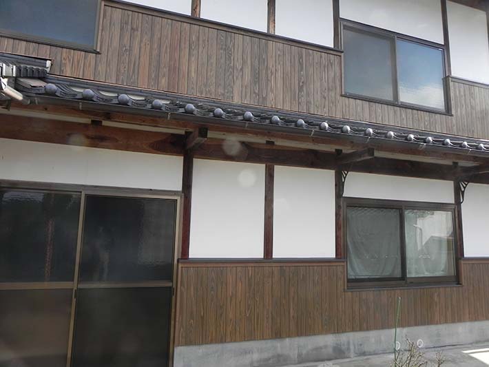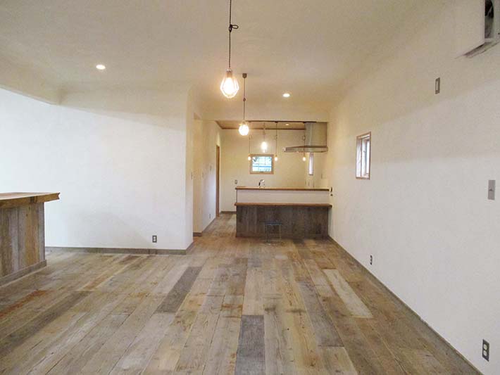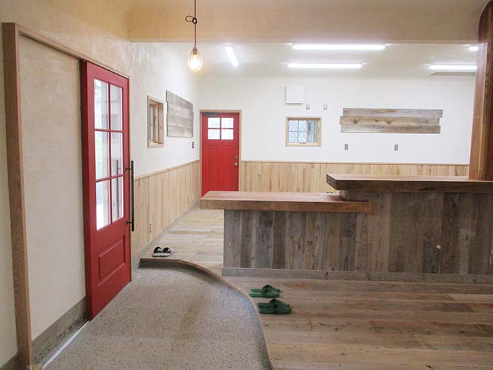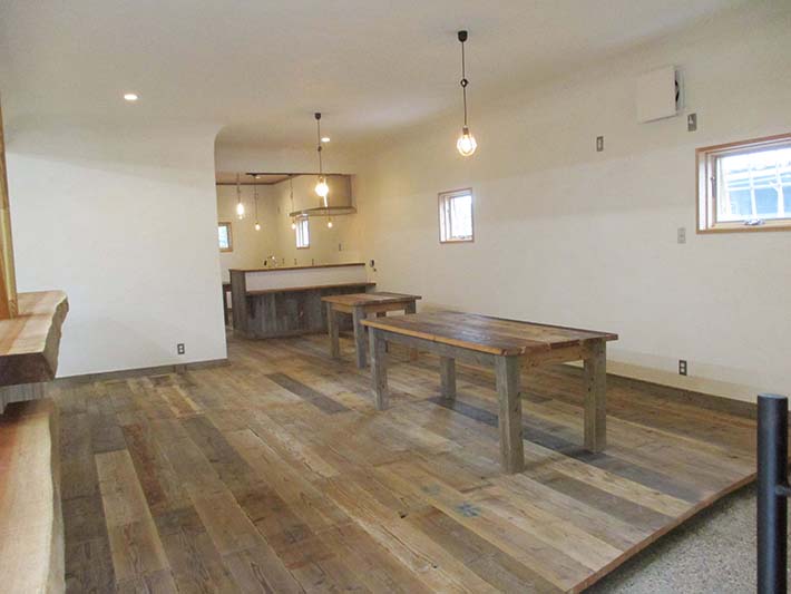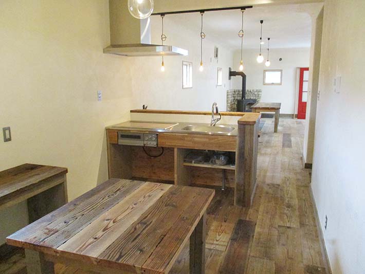 床材には道板フローリングを施工したり、外壁にも古材を貼ったりしています。