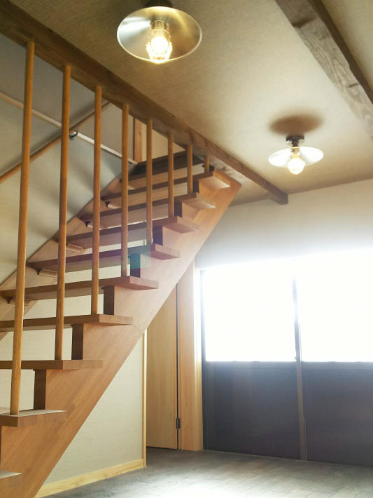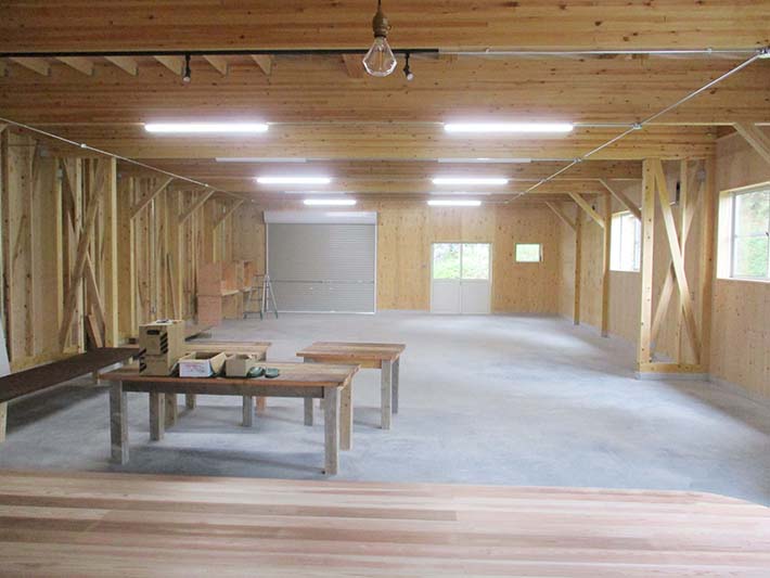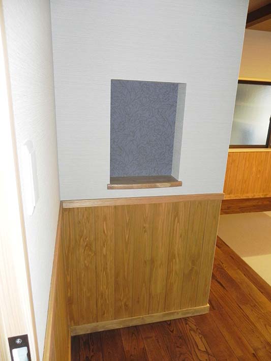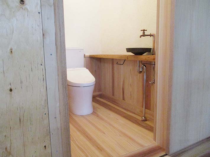 土間床部分に断熱材を施工し、無垢床フローリングを施工しました。内部の腰に杉板を貼ったり、外壁には焼杉板を貼って和風のイメージに仕上げています。