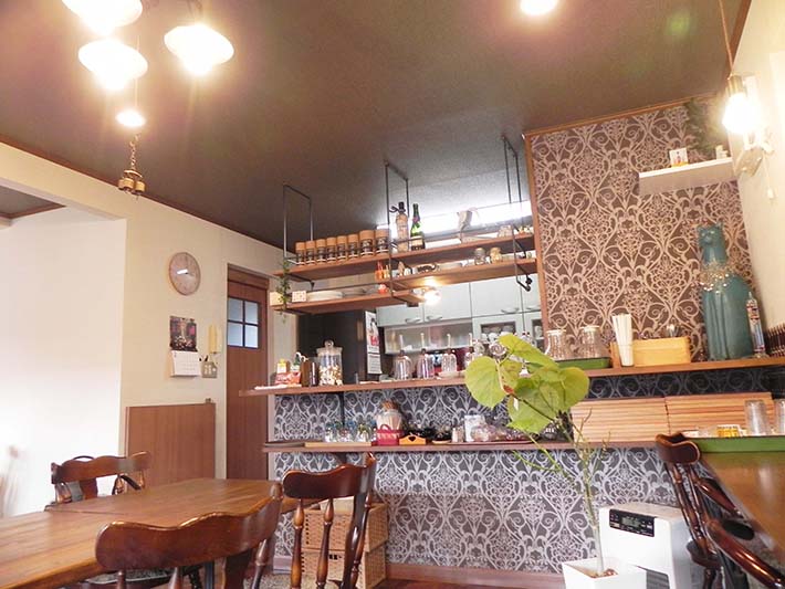 住宅のLDKをリノベーションしてカフェ空間にしました。昭和レトロをイメージして施主様と一緒に壁紙やモザイクタイルや照明器具にもこだわって空間造りをしています。